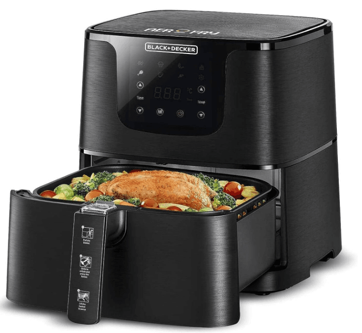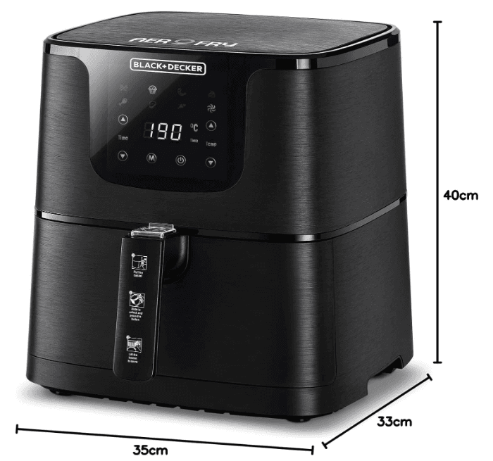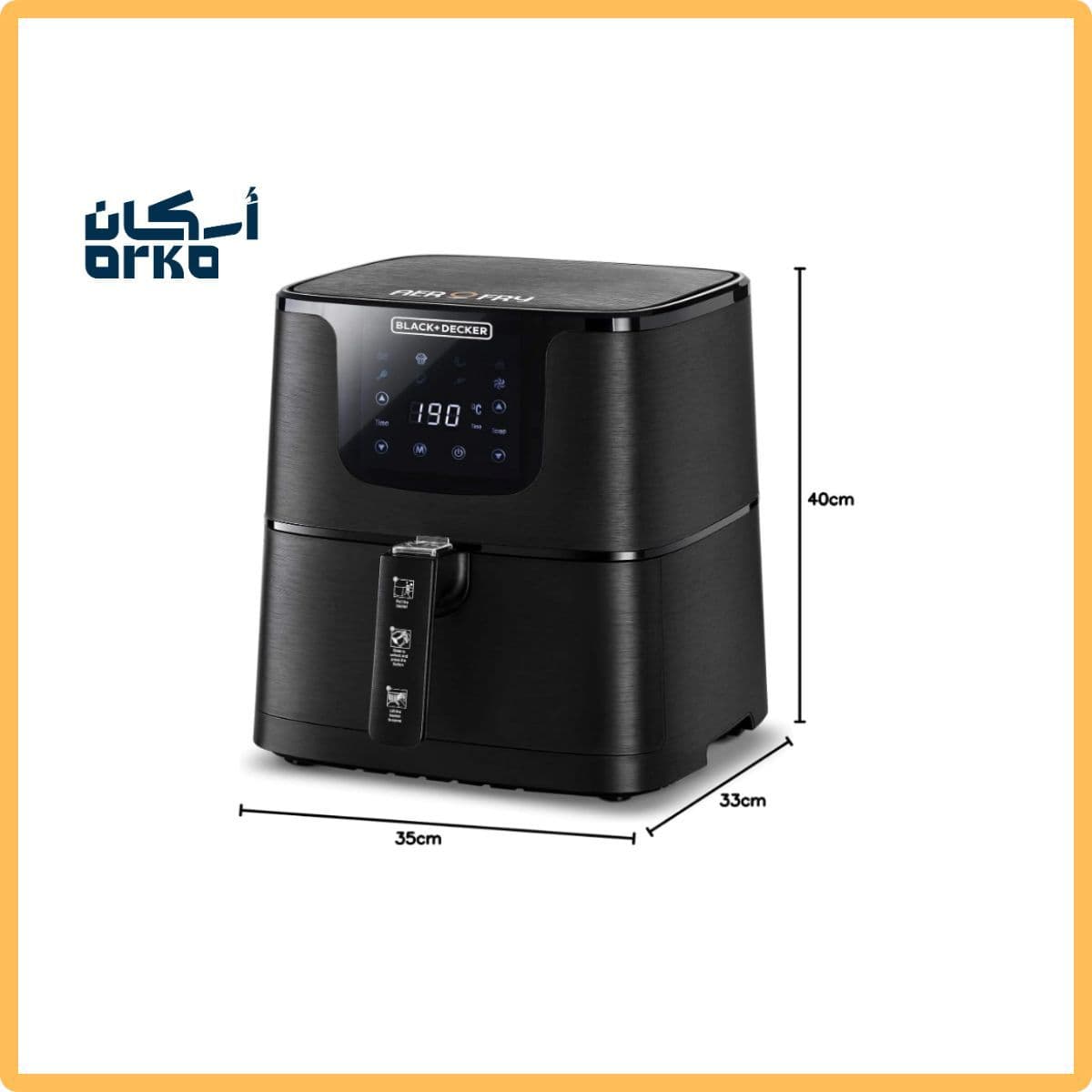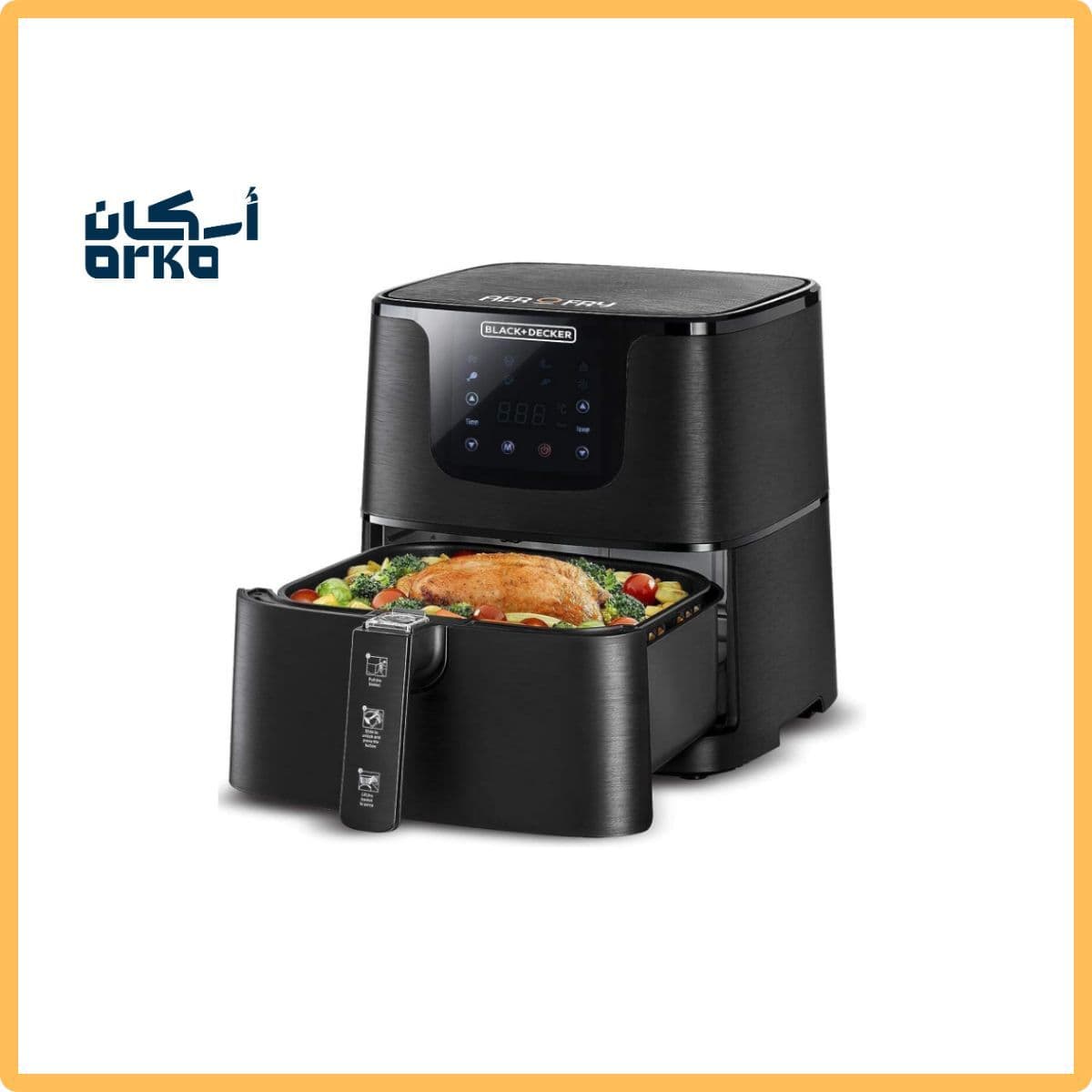 Discover a healthier way to cook with the Black & Decker 5.8L Air Fryer; Black, designed to deliver powerful performance and deliciously crispy results with little to no oil. Thanks to its rapid hot air circulation technology, you’ll enjoy your favorite fried foods with significantly less fat without compromising on taste or texture. The 5.8 Liter capacity makes it perfect for preparing family sized meals for 4–5 people. Its intuitive digital control panel and multiple preset programs give you complete flexibility to fry, bake, grill, and roast a wide variety of dishes. Stylish black design, premium build quality, and easy-clean detachable parts all in one smart appliance that transforms everyday cooking.