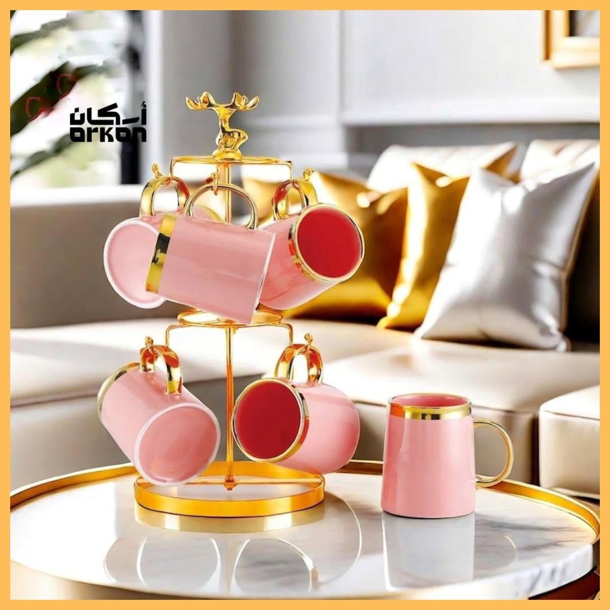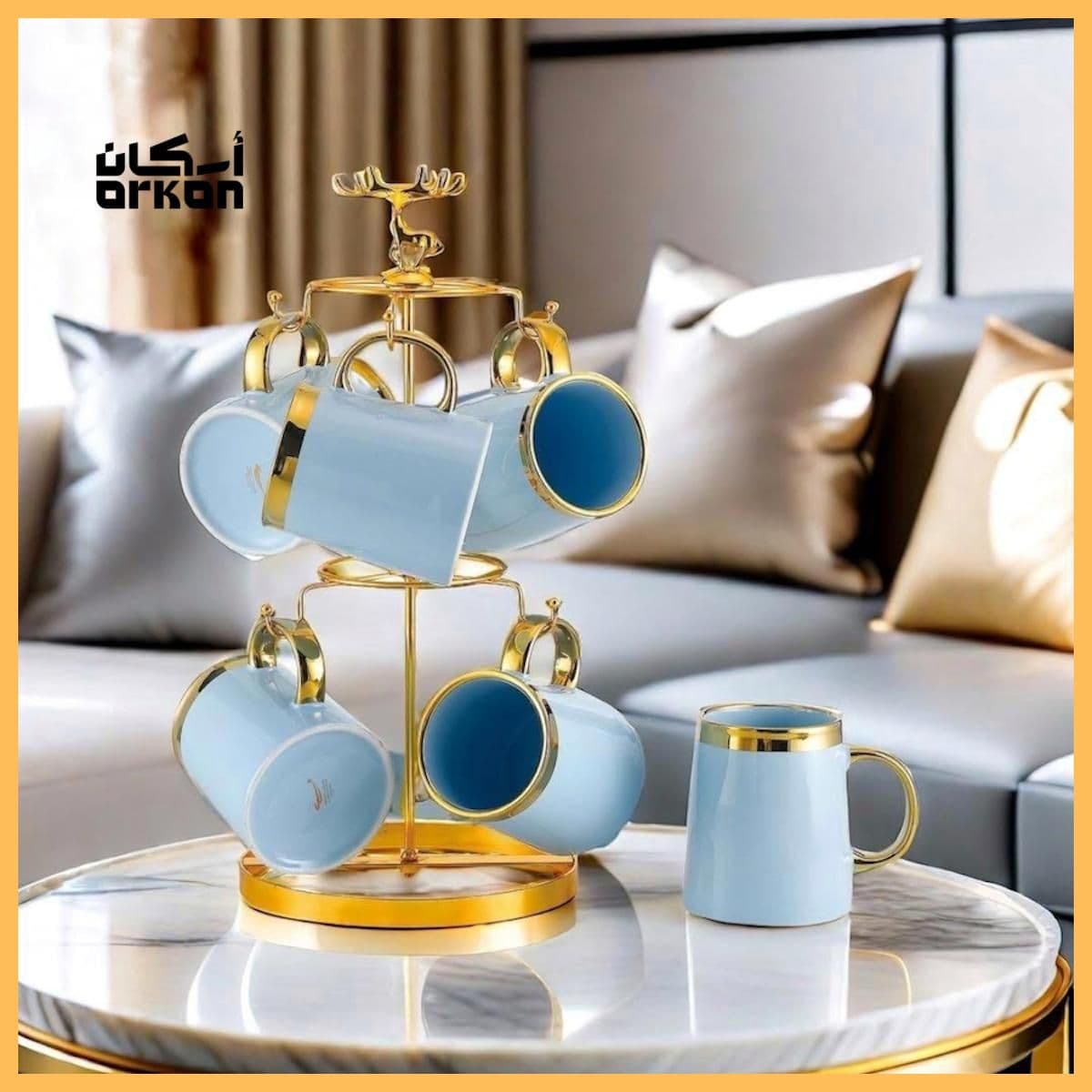 Coffee Mug Set on Golden Steel Holder (6 Pieces)